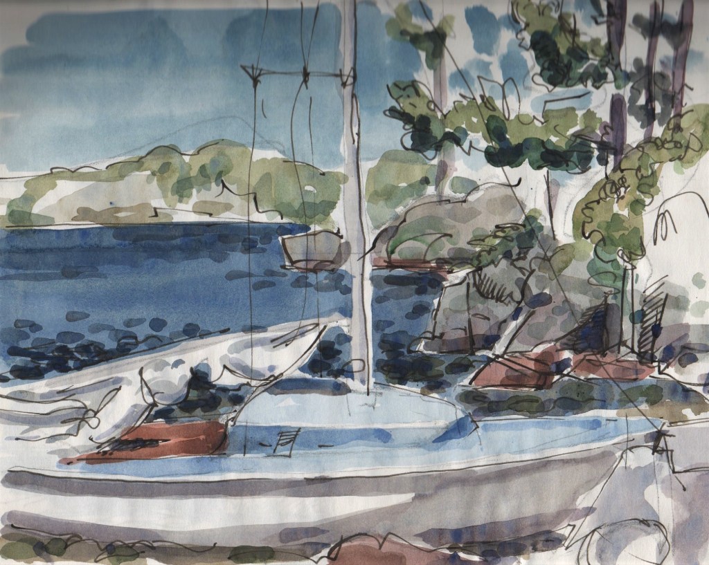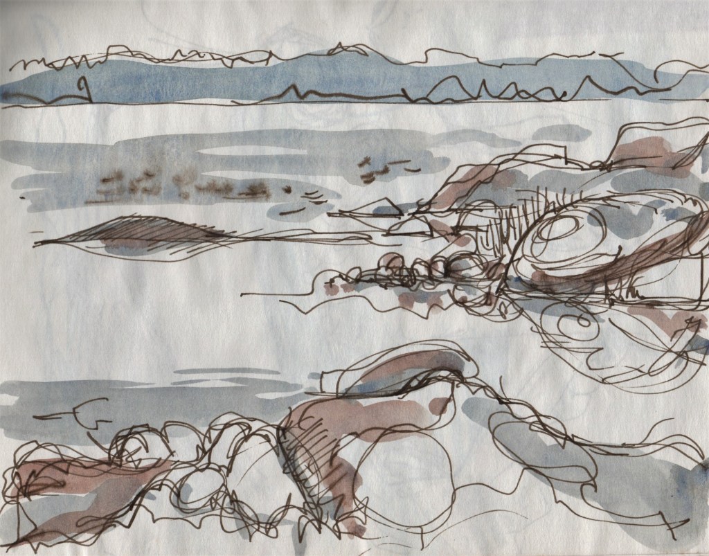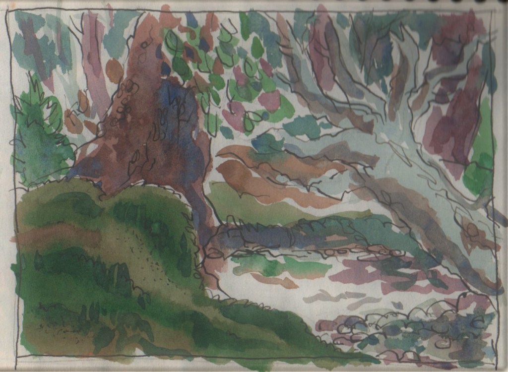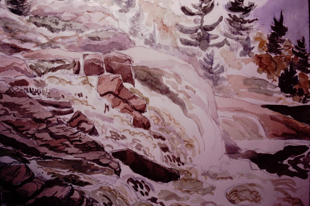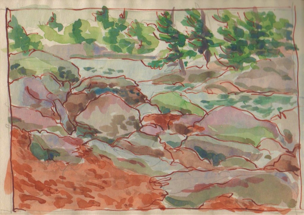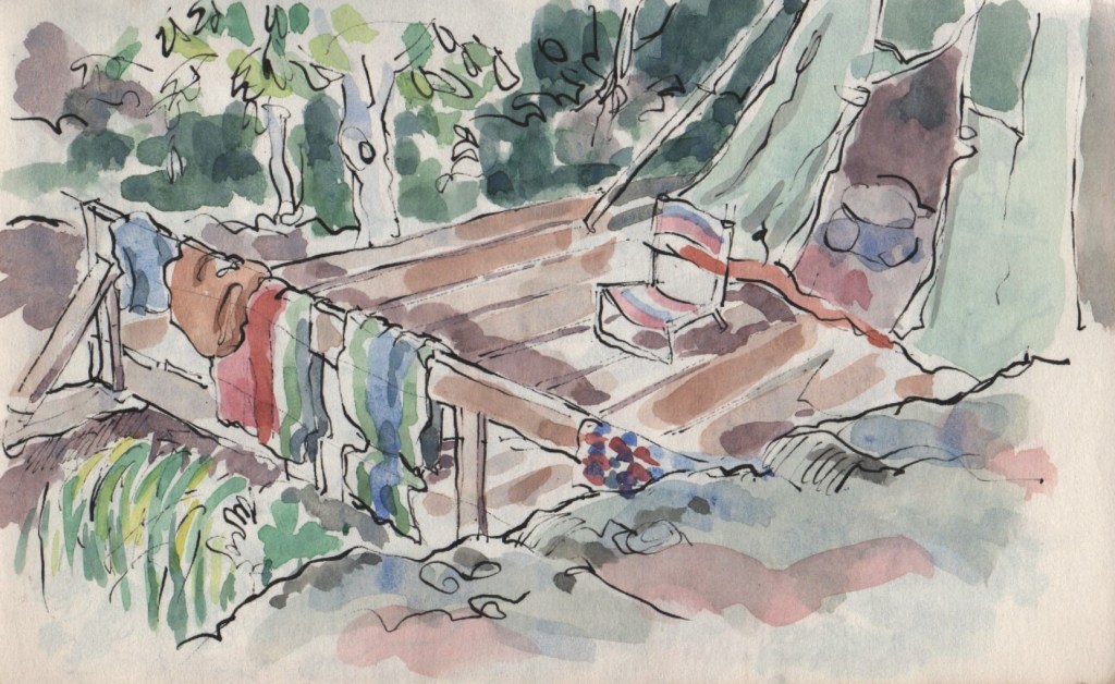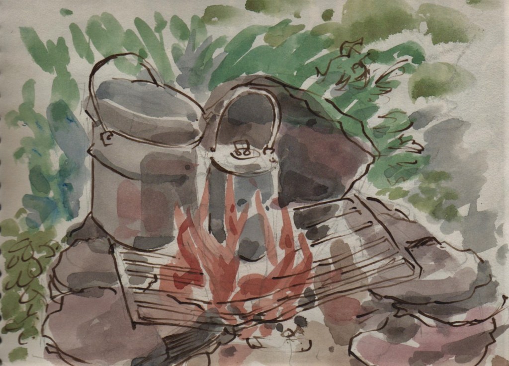 Being part of a small group of people travelling together, isolated from the rest of the world, is uncommon to most of us today. Our expectations were that at the end of our trip we would be smoothly returned to the places from which we departed with little change in either one. But that cannot be guaranteed although I did not mention this to my group at the time. There were some interesting internal dynamics and the one that sticks in my mind is the division around booze. I enjoy my glass of beer with dinner but providing myself with an equivalent supply of alcohol (plus some to share) for two weeks would be awkward so I decided to do without. But some of the party were loth to abstain and so the camp divided into two squads, wet and dry. The wets looked forward to their tipple at the end of the day as dinner was being prepared. The presence of drys at tipple time was awkward because the wets, carefully managing their supply, could not afford to share. I avoided this awkwardness, once camp was set up and firewood gathered, by going for a walk with my sketchbook. At the end of the trip I had accumulated sixty small drawings and paintings.
