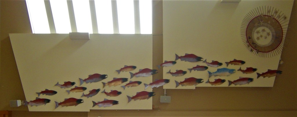 A large silver salmon was included near the front of the shoal of migrating salmon. This fish could be imagined as the guiding salmon spirit. When one of our Ministers asked me about the silver fish I told her it could be the Jesus Fish.